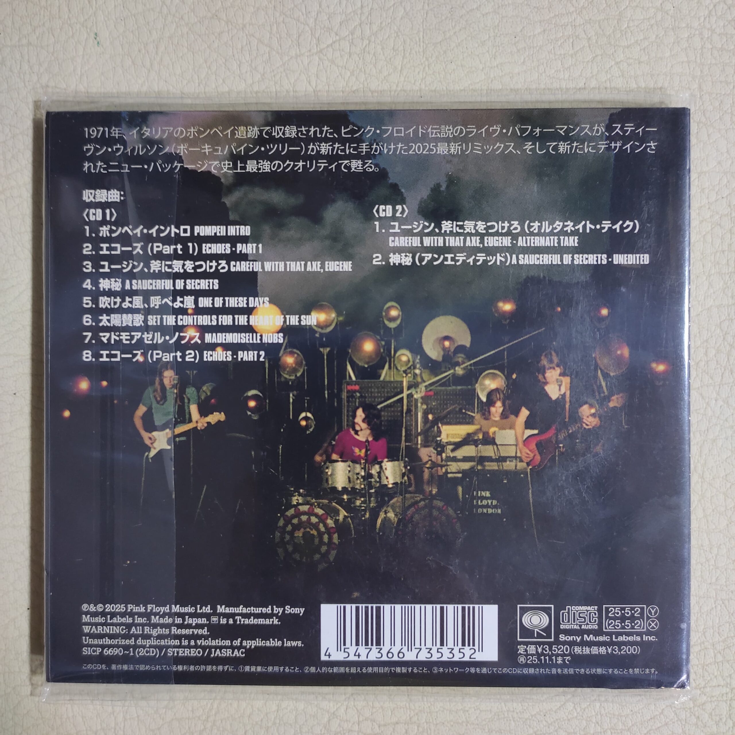 La legendaria actuación en directo de Pink Floyd de 1971 en las ruinas de Pompeya regresa con la mejor calidad hasta la fecha. El audio incluye una nueva remezcla de Steven Wilson (Porcupine Tree). Grabada en octubre de 1971 en el “Anfiteatro” de las ruinas de Pompeya, Patrimonio de la Humanidad por la UNESCO, esta actuación en directo fue sin público. Incluye una versión alternativa de “Careful with That Axe, Eugene” y una versión larga de “A Saucerful of Secrets”. Incluye letra y descripción. Presenta un diseño de funda blanda.