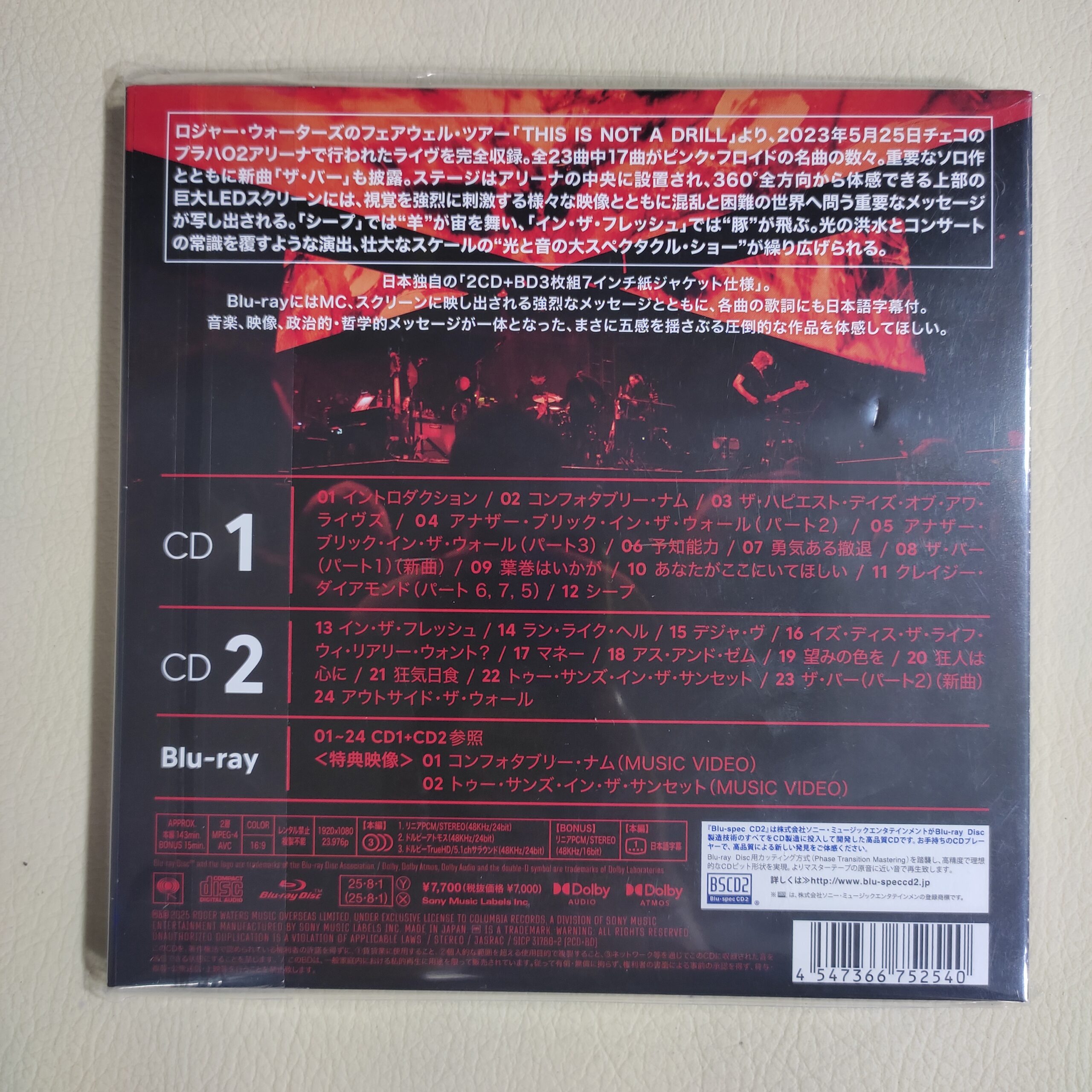 la gira de despedida de Roger Waters, capturada en un set de 3 discos (2 CD + Blu-ray) exclusivo para Japón en formato Blu-ray CD2 de 7 pulgadas. Incluye el formato Blu-Spec CD2 de alta fidelidad. La gira «This Is Not A Drill» de Roger Waters marcó su primera gira a gran escala en cuatro años desde US+THEM (2017-2018) y fue anunciada como su gira de despedida. Esta gira mundial recibió una gran aclamación y fue un gran éxito. La presentación completa en vivo, grabada en Praga, República Checa, los días 24 y 25 de mayo de 2023, está incluida en este lanzamiento. De los 23 temas interpretados, 17 son canciones legendarias de Pink Floyd. También se incluyen temas solistas clave, junto con la nueva canción «The Bar». Incluye notas del álbum, letras y traducciones al japonés.